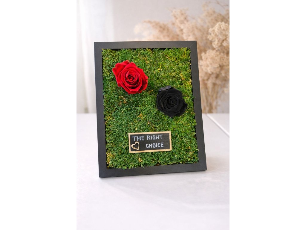 Dvě stabilizované růže zasazené do přírodního mechu připomínají, že protiklady mohou existovat vedle sebe. Ne jako soupeři, ale jako součást jednoho rozhodnutí. Toho, které je v souladu s vámi.