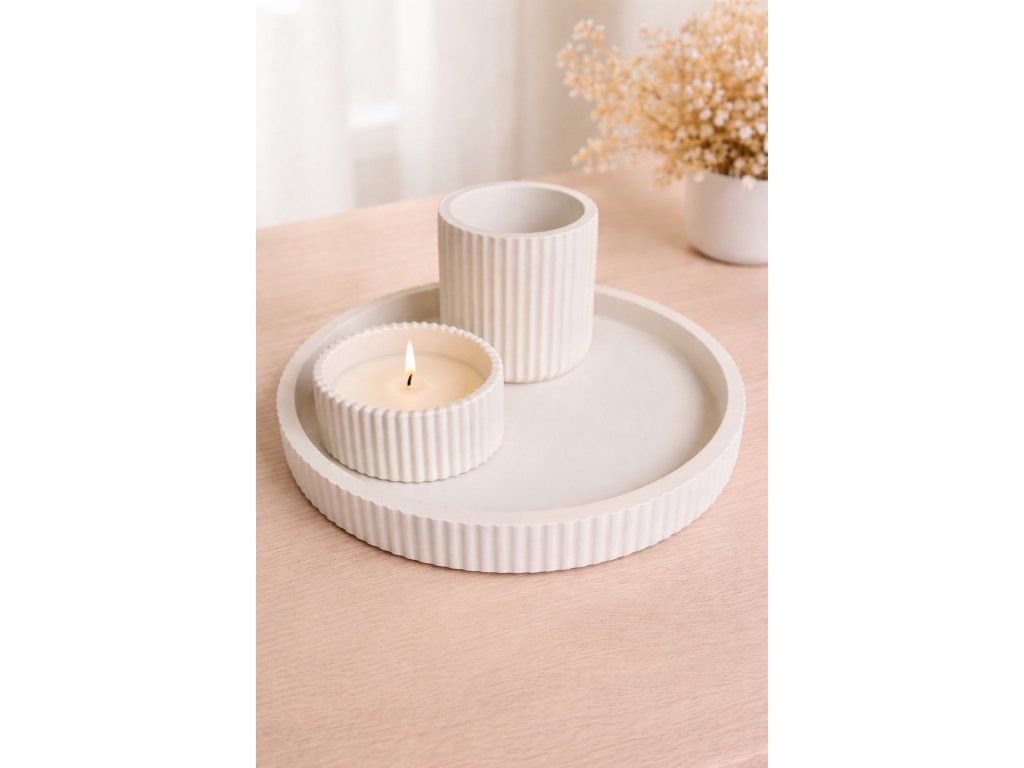 Minimalistický vroubkovaný podnos doplněný kalíškem a ručně litou svíčkou ze 100% sójového vosku vytváří harmonický detail do každého interiéru. Jemné linie a čisté tóny působí klidně, nadčasově a luxusně.
